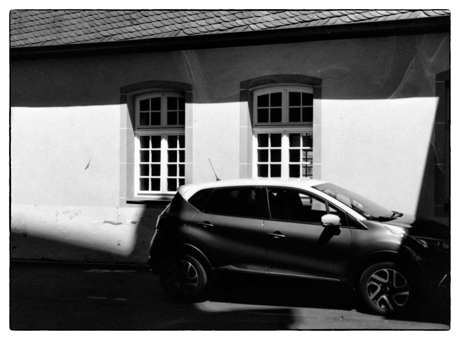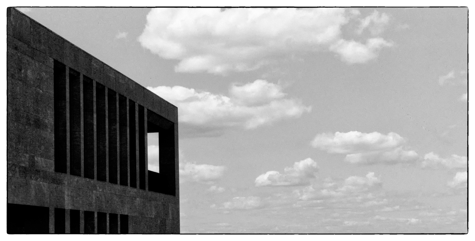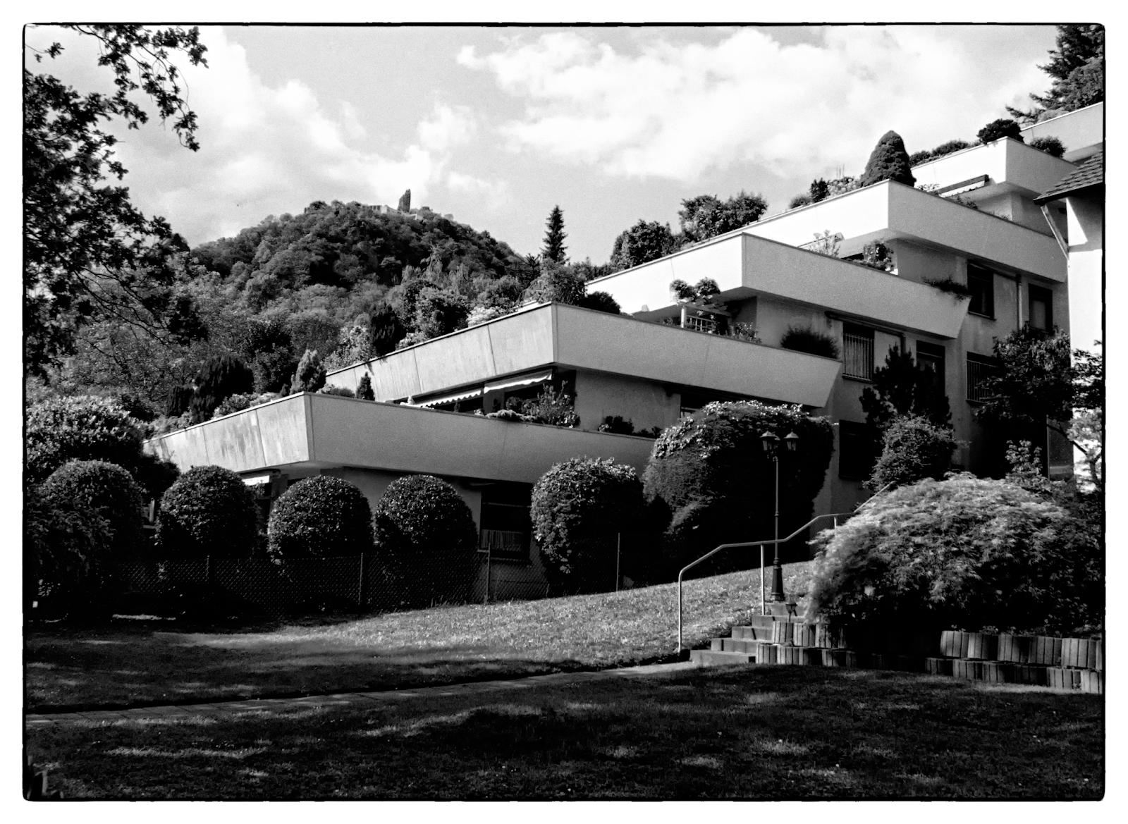 - Bei diesem Bild hatte ich wegen wechselnder Bewölkung den T-max 100 @ ISO 200 belichtet. Man erkennt, dass Mortensen auch mit hohen Kontrasten gut klar kommt. Eine Belichtung mit @ISO 64 (die eigentliche Nennempfindlichkeit in 510-Pyro) wäre sicher noch besser gewesen für die Schattenzeichnung, jedoch wird so das Gebäude betont und der Blick darauf gelenkt. Belichtet wurde auf die hellsten Fassadenteile des Gebäudes.