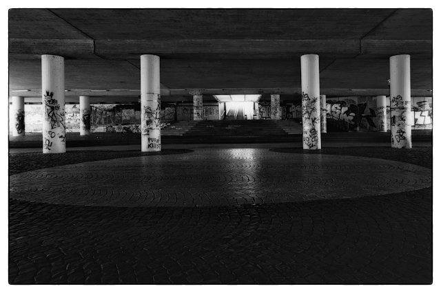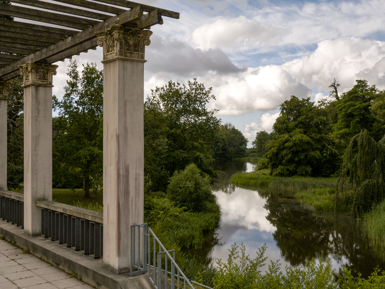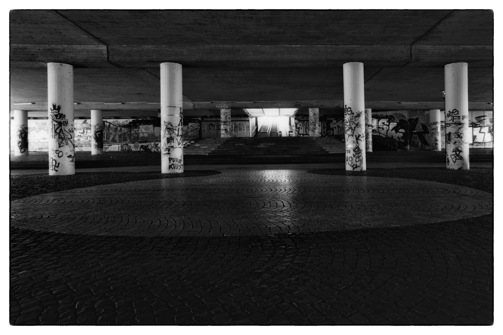 - Bei diesem Bild hatte ich wegen wechselnder Bewölkung den T-max 100 @ ISO 200 belichtet. Man erkennt, dass Mortensen auch mit hohen Kontrasten gut klar kommt. Eine Belichtung mit @ISO 64 (die eigentliche Nennempfindlichkeit in 510-Pyro) wäre sicher noch besser gewesen für die Schattenzeichnung, jedoch wird so das Gebäude betont und der Blick darauf gelenkt. Belichtet wurde auf die hellsten Fassadenteile des Gebäudes.