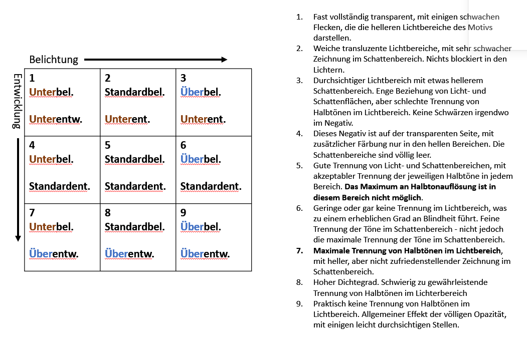 Ein Negativ #7 oder #7D ist relativ unempfindlich gegenüber der Entwicklungsdauer, jedoch sehr empfindlich in Bezug auf die Belichtung. Aus diesem Grund empfiehlt Mortensen das Bracketing - zu Recht!